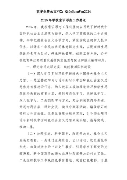 【七哥公文】2025年:2025年学校意识形态工作要点+更多免费公文+VX:QiGeGongWen2024+更多免费公文+VX:QiGeGongWen2024