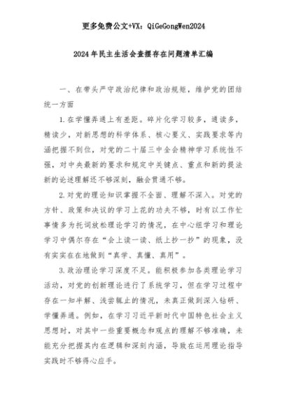【七哥公文】2025年:2024年民主生活会查摆存在问题清单汇编+更多免费公文+VX:QiGeGongWen2024+更多免费公文+VX:QiGeGongWen2024