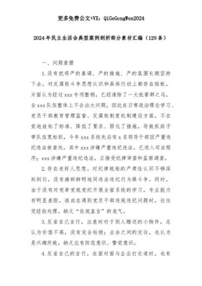 【七哥公文】2025年:2024年民主生活会典型案例剖析部分素材汇编(129条)+更多免费公文+VX:QiGeGongWen2024+更多免费公文+VX:QiGeGongWen2024