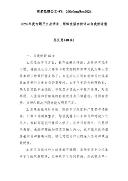 【七哥公文】2025年:(48条)2024年度专题民主生活会、组织生活会批评与自我批评意见汇总+更多免费公文+VX:QiGeGongWen2024+更多免费公文+VX:QiGeGongWen2024