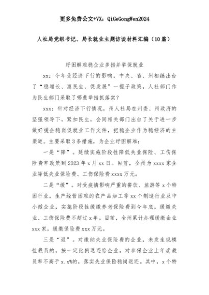 【七哥公文】2025年:(10篇)人社局党组书记、局长就业主题访谈材料汇编+更多免费公文+VX:QiGeGongWen2024+更多免费公文+VX:QiGeGongWen2024