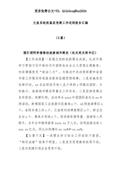 【七哥公文】2025年:(5篇)文旅系统抓基层党建工作述职报告汇编+更多免费公文+VX:QiGeGongWen2024+更多免费公文+VX:QiGeGongWen2024