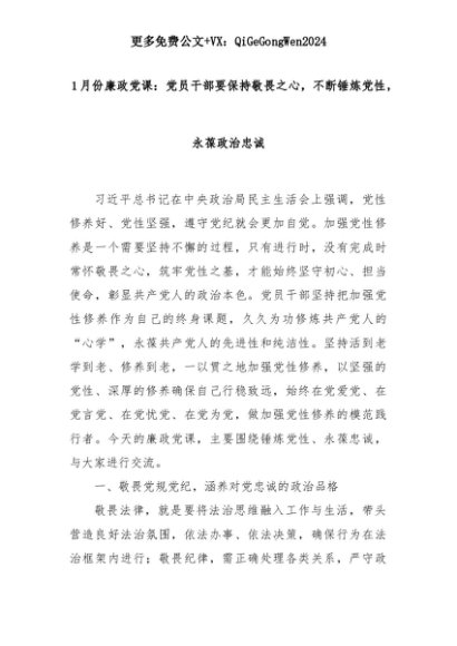 【七哥公文】2025年:1月份廉政党课:党员干部要保持敬畏之心,不断锤炼党性,永葆政治忠诚+更多免费公文+VX:QiGeGongWen2024+更多免费公文+VX:QiGeGongWen2024