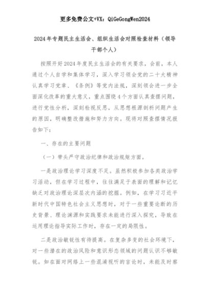 【七哥公文】2025年:2024年专题民主生活会、组织生活会对照检查材料(领导干部个人)+更多免费公文+VX:QiGeGongWen2024+更多免费公文+VX:QiGeGongWen2024