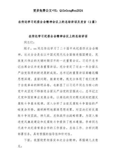 【七哥公文】2025年:(2篇)在传达学习纪委全会精神会议上的总结讲话及发言+更多免费公文+VX:QiGeGongWen2024+更多免费公文+VX:QiGeGongWen2024