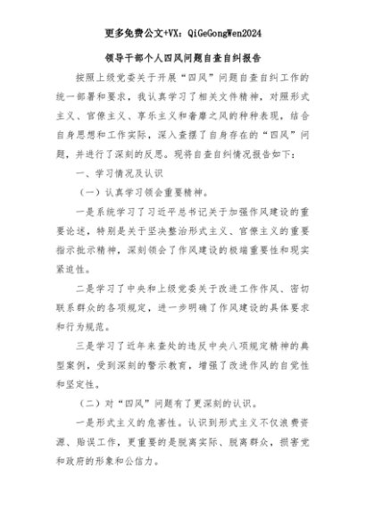 【七哥公文】2025年:领导干部个人四风问题自查自纠报告+更多免费公文+VX:QiGeGongWen2024+更多免费公文+VX:QiGeGongWen2024