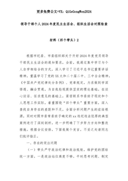 【七哥公文】2025年:领导干部个人2024年度民主生活会、组织生活会对照检查材料(四个带头)2+更多免费公文+VX:QiGeGongWen2024+更多免费公文+VX:QiGeGongWen2024