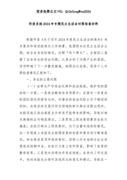 【七哥公文】2025年:科技系统2024年专题民主生活会对照检查材料+更多免费公文+VX:QiGeGongWen2024+更多免费公文+VX:QiGeGongWen2024