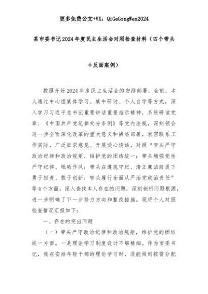 【七哥公文】2025年:某市委书记2024年度民主生活会对照检查材料(四个带头+反面案例)+更多免费公文+VX:QiGeGongWen2024+更多免费公文+VX:QiGeGongWen2024