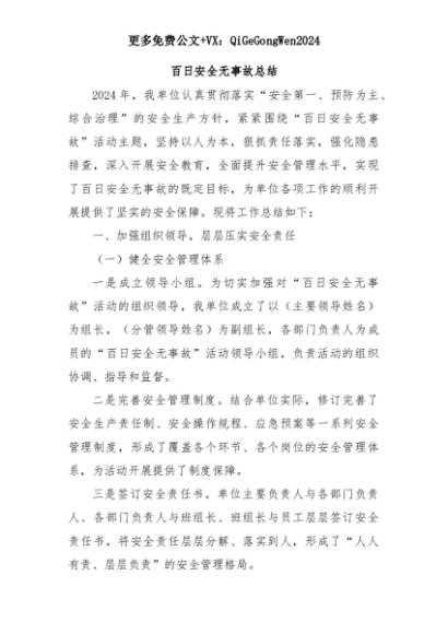 【七哥公文】2025年:百日安全无事故总结+更多免费公文+VX:QiGeGongWen2024+更多免费公文+VX:QiGeGongWen2024