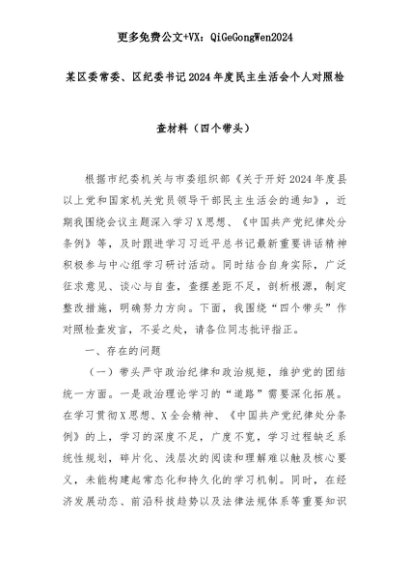 【七哥公文】2025年:某区委常委、区纪委书记2024年度民主生活会个人对照检查材料(四个带头)+更多免费公文+VX:QiGeGongWen2024+更多免费公文+VX:QiGeGongWen2024