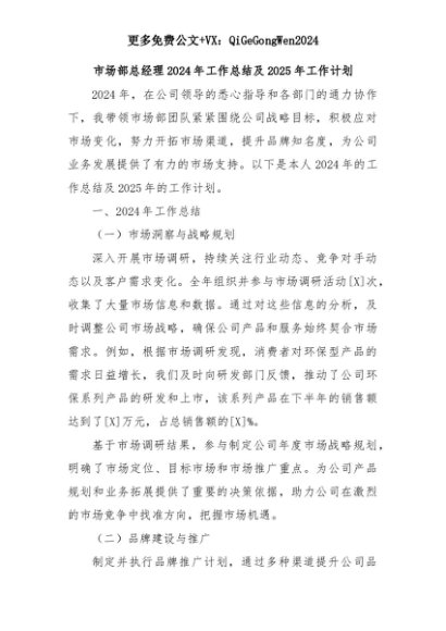 【七哥公文】2025年:市场部总经理2024年工作总结及2025年工作计划+更多免费公文+VX:QiGeGongWen2024+更多免费公文+VX:QiGeGongWen2024