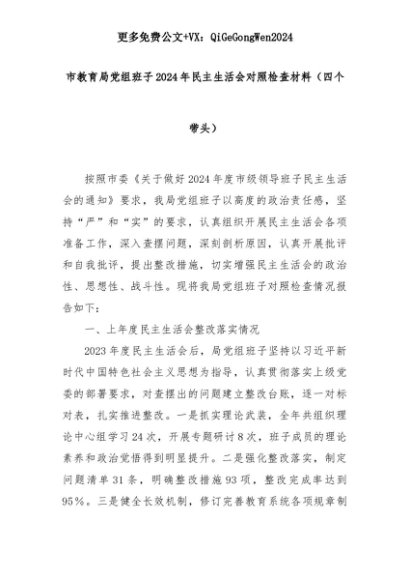 【七哥公文】2025年:市教育局党组班子2024年民主生活会对照检查材料(四个带头)+更多免费公文+VX:QiGeGongWen2024+更多免费公文+VX:QiGeGongWen2024