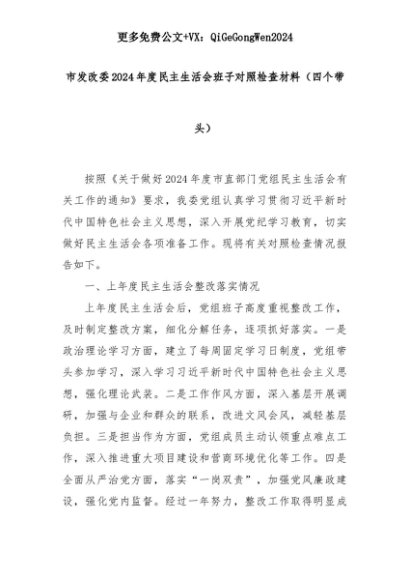 【七哥公文】2025年:市发改委2024年度民主生活会班子对照检查材料(四个带头)+更多免费公文+VX:QiGeGongWen2024+更多免费公文+VX:QiGeGongWen2024