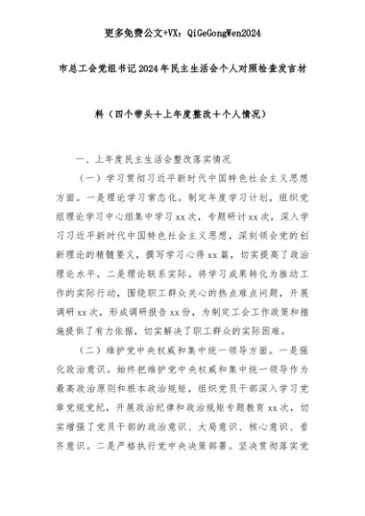 【七哥公文】2025年:市总工会党组书记2024年民主生活会个人对照检查发言材料(四个带头+上年度整改+个人情况)+更多免费公文+VX:QiGeGongWen2024+更多免费公文+VX:QiGeGongWen2024