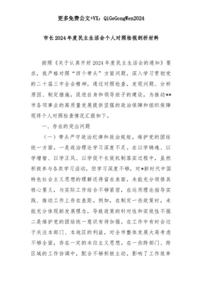 【七哥公文】2025年:市长2024年度民主生活会个人对照检视剖析材料+更多免费公文+VX:QiGeGongWen2024+更多免费公文+VX:QiGeGongWen2024