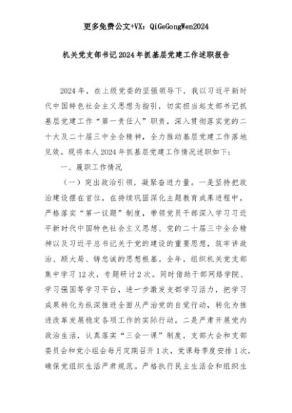 【七哥公文】2025年:机关党支部书记2024年抓基层党建工作述职报告+更多免费公文+VX:QiGeGongWen2024+更多免费公文+VX:QiGeGongWen2024