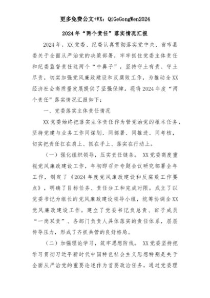 【七哥公文】2025年:2024年“两个责任”落实情况汇报+更多免费公文+VX:QiGeGongWen2024+更多免费公文+VX:QiGeGongWen2024