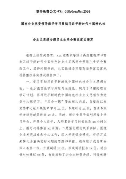 【七哥公文】2025年:国有企业党委领导班子学习贯彻习近平新时代中国特色社会主义思想专题民主生活会整改落实情况+更多免费公文+VX:QiGeGongWen2024+更多免费公文+VX:QiGeGongWen2024