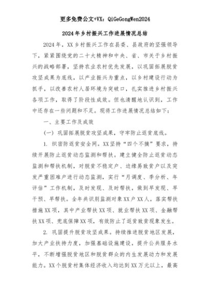【七哥公文】2025年:2024年乡村振兴工作进展情况总结+更多免费公文+VX:QiGeGongWen2024+更多免费公文+VX:QiGeGongWen2024