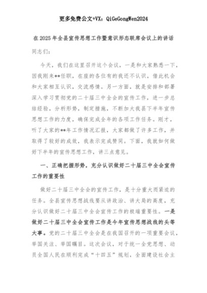 【七哥公文】2025年:在2025年全县宣传思想工作暨意识形态联席会议上的讲话+更多免费公文+VX:QiGeGongWen2024+更多免费公文+VX:QiGeGongWen2024