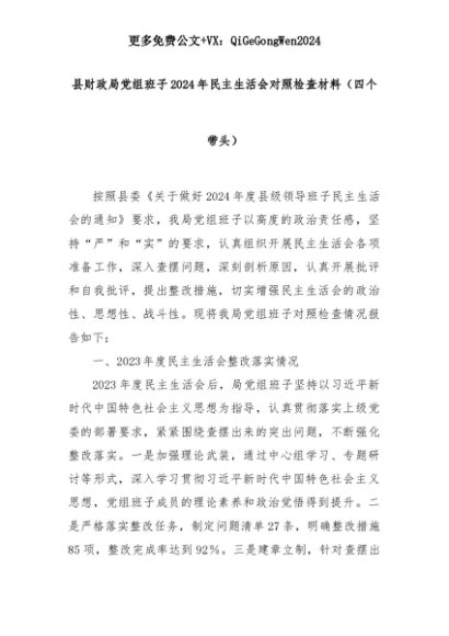 【七哥公文】2025年:县财政局党组班子2024年民主生活会对照检查材料(四个带头)+更多免费公文+VX:QiGeGongWen2024+更多免费公文+VX:QiGeGongWen2024