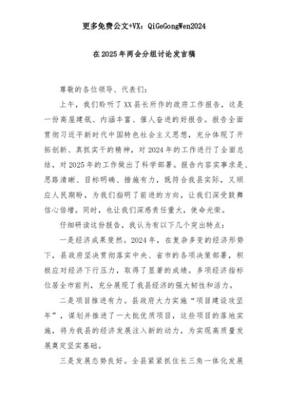 【七哥公文】2025年:在2025年两会分组讨论发言稿+更多免费公文+VX:QiGeGongWen2024+更多免费公文+VX:QiGeGongWen2024