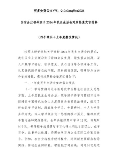【七哥公文】2025年:国有企业领导班子2024年民主生活会对照检查发言材料(四个带头+上年度整改情况)+更多免费公文+VX:QiGeGongWen2024+更多免费公文+VX:QiGeGongWen2024