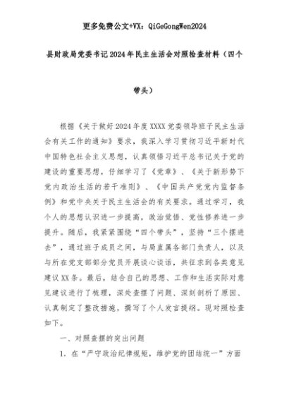 【七哥公文】2025年:县财政局党委书记2024年民主生活会对照检查材料(四个带头)+更多免费公文+VX:QiGeGongWen2024+更多免费公文+VX:QiGeGongWen2024