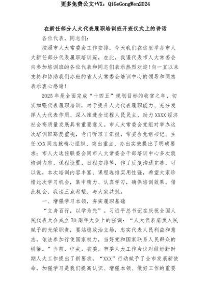 【七哥公文】2025年:在新任部分人大代表履职培训班开班仪式上的讲话+更多免费公文+VX:QiGeGongWen2024+更多免费公文+VX:QiGeGongWen2024