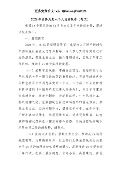 【七哥公文】2025年:2024年主要负责人个人述法报告(范文)+更多免费公文+VX:QiGeGongWen2024+更多免费公文+VX:QiGeGongWen2024
