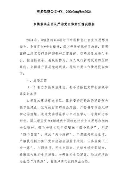 【七哥公文】2025年:乡镇落实全面从严治党主体责任情况报告+更多免费公文+VX:QiGeGongWen2024+更多免费公文+VX:QiGeGongWen2024
