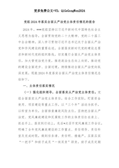 【七哥公文】2025年:党组2024年落实全面从严治党主体责任情况的报告+更多免费公文+VX:QiGeGongWen2024+更多免费公文+VX:QiGeGongWen2024