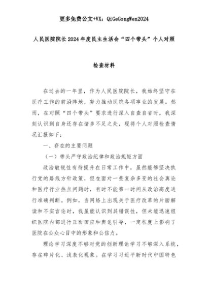 【七哥公文】2025年:人民医院院长2024年度民主生活会“四个带头”个人对照检查材料+更多免费公文+VX:QiGeGongWen2024+更多免费公文+VX:QiGeGongWen2024