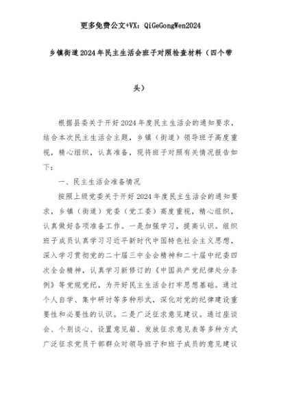 【七哥公文】2025年:乡镇街道2024年民主生活会班子对照检查材料(四个带头)+更多免费公文+VX:QiGeGongWen2024+更多免费公文+VX:QiGeGongWen2024