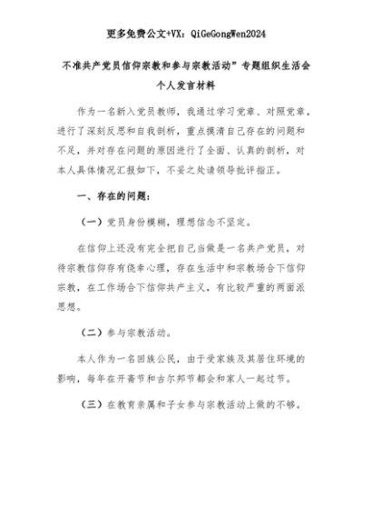 【七哥公文】2025年:不准共产党员信仰宗教和参与宗教活动”专题组织生活会个人发言材料+更多免费公文+VX:QiGeGongWen2024+更多免费公文+VX:QiGeGongWen2024