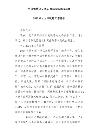 【七哥公文】2025年:2025年xxx市政府工作报告+更多免费公文+VX:QiGeGongWen2024+更多免费公文+VX:QiGeGongWen2024