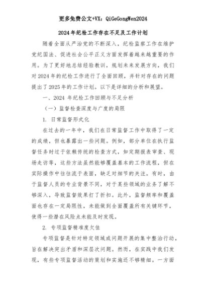 【七哥公文】2025年:2024年纪检工作存在不足及工作计划+更多免费公文+VX:QiGeGongWen2024+更多免费公文+VX:QiGeGongWen2024