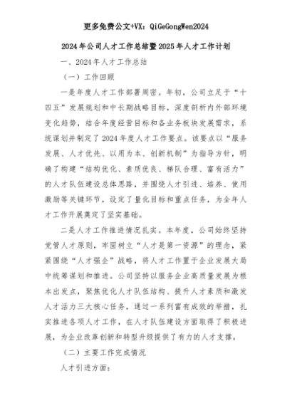 【七哥公文】2025年:2024年公司人才工作总结暨2025年人才工作计划+更多免费公文+VX:QiGeGongWen2024+更多免费公文+VX:QiGeGongWen2024