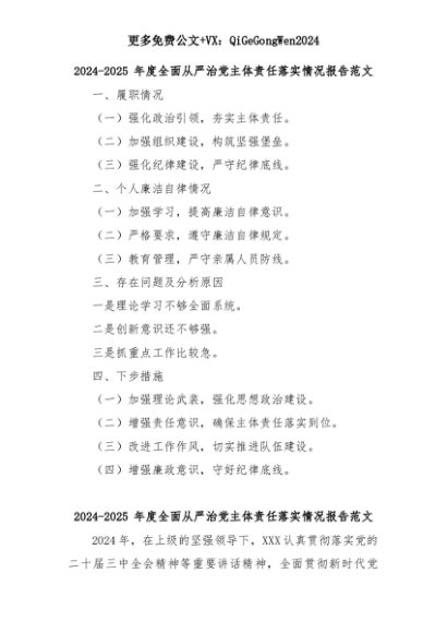 【七哥公文】2025年:2024-2025 年度全面从严治党主体责任落实情况报告范文 (2)+更多免费公文+VX:QiGeGongWen2024+更多免费公文+VX:QiGeGongWen2024