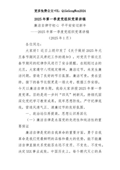 【七哥公文】2025年:2025年第一季度党组织党课讲稿+更多免费公文+VX:QiGeGongWen2024+更多免费公文+VX:QiGeGongWen2024