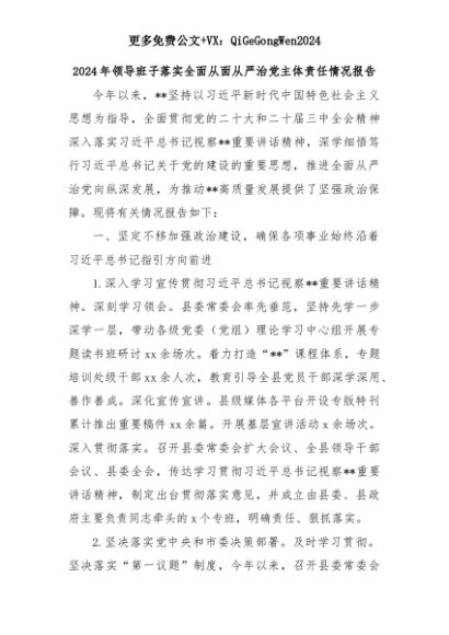 【七哥公文】2025年:2024年领导班子落实全面从面从严治党主体责任情况报告+更多免费公文+VX:QiGeGongWen2024+更多免费公文+VX:QiGeGongWen2024