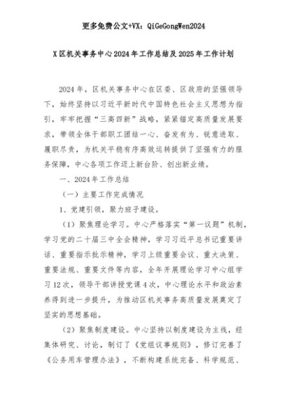 【七哥公文】2025年:X区机关事务中心2024年工作总结及2025年工作计划+更多免费公文+VX:QiGeGongWen2024+更多免费公文+VX:QiGeGongWen2024