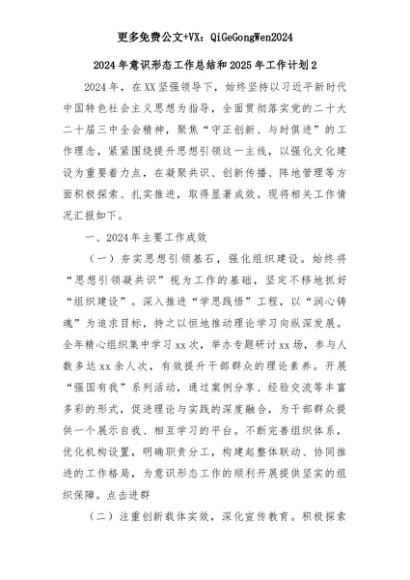 【七哥公文】2025年:2024年意识形态工作总结和2025年工作计划2+更多免费公文+VX:QiGeGongWen2024+更多免费公文+VX:QiGeGongWen2024
