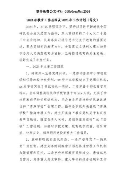 【七哥公文】2025年:2024年教育工作总结及2025年工作计划(范文)+更多免费公文+VX:QiGeGongWen2024+更多免费公文+VX:QiGeGongWen2024