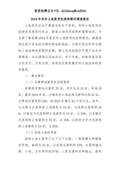 【七哥公文】2025年:2024年农村土地使用权流转情况调查报告+更多免费公文+VX:QiGeGongWen2024+更多免费公文+VX:QiGeGongWen2024