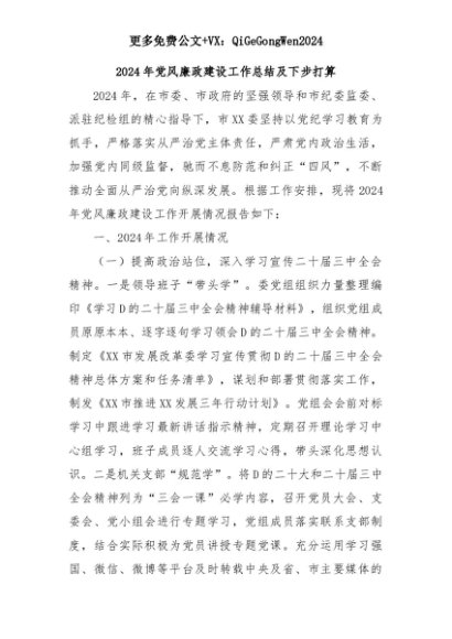 【七哥公文】2025年:2024年党风廉政建设工作总结及下步打算+更多免费公文+VX:QiGeGongWen2024+更多免费公文+VX:QiGeGongWen2024