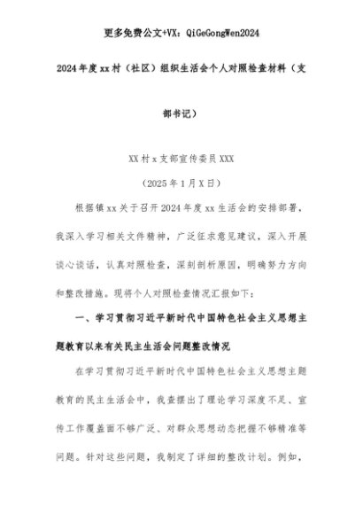 【七哥公文】2025年:2024年度xx村(社区)组织生活会个人对照检查材料(宣传委员)+更多免费公文+VX:QiGeGongWen2024+更多免费公文+VX:QiGeGongWen2024