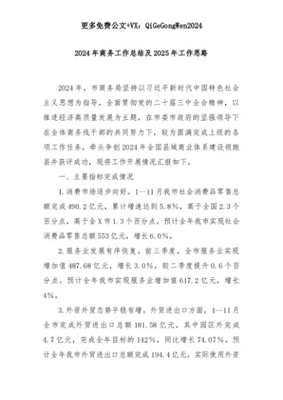 【七哥公文】2025年:2024年商务工作总结及2025年工作思路+更多免费公文+VX:QiGeGongWen2024+更多免费公文+VX:QiGeGongWen2024