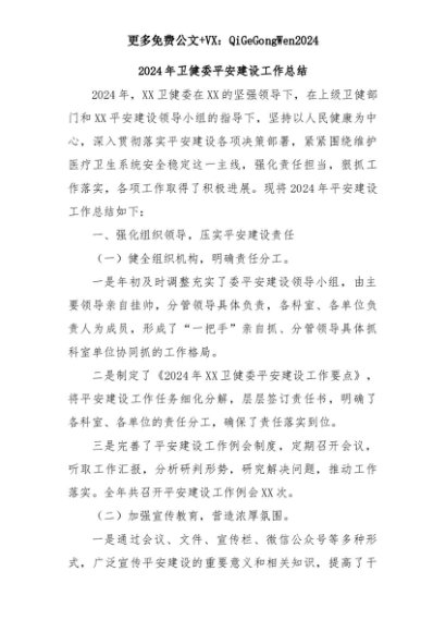 【七哥公文】2025年:2024年卫健委平安建设工作总结+更多免费公文+VX:QiGeGongWen2024+更多免费公文+VX:QiGeGongWen2024
